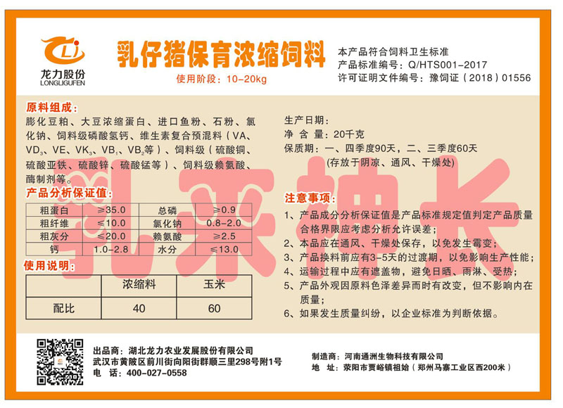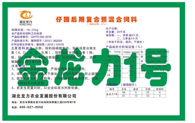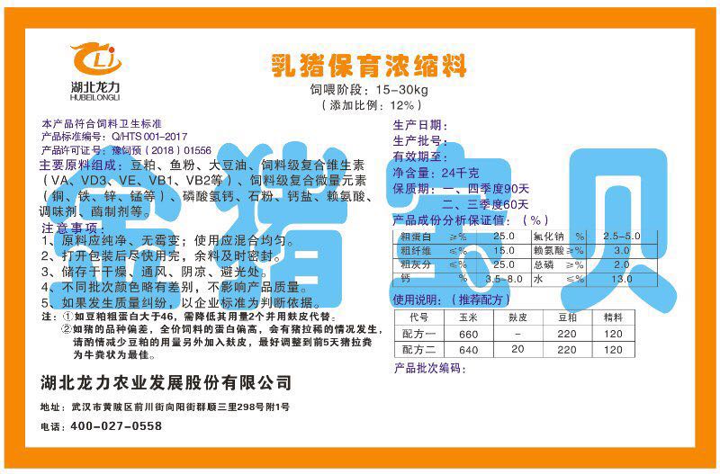 湖北龍力農(nóng)業(yè)發(fā)展股份有限公司坐落于武漢市黃陂區(qū)前川街向陽街群順三里298號附1號。公司成立于2014年6月,公司自成立以來把“創(chuàng)全球最大養(yǎng)豬綜合服務”為企業(yè)愿景。致力于打造教保料品牌”作為公司發(fā)展的明確目標。公司一直致力于豬營養(yǎng)的研究和開發(fā),積極與國內(nèi)外高校和科研機構(gòu)合作,推廣養(yǎng)豬技術(shù)、動物營養(yǎng)新概念,向世界農(nóng)牧企業(yè)學習與合作。公司采用國內(nèi)先進的生產(chǎn)工藝,選擇高精度電子配料秤,高均勻度、無殘留混合機等先進設備....